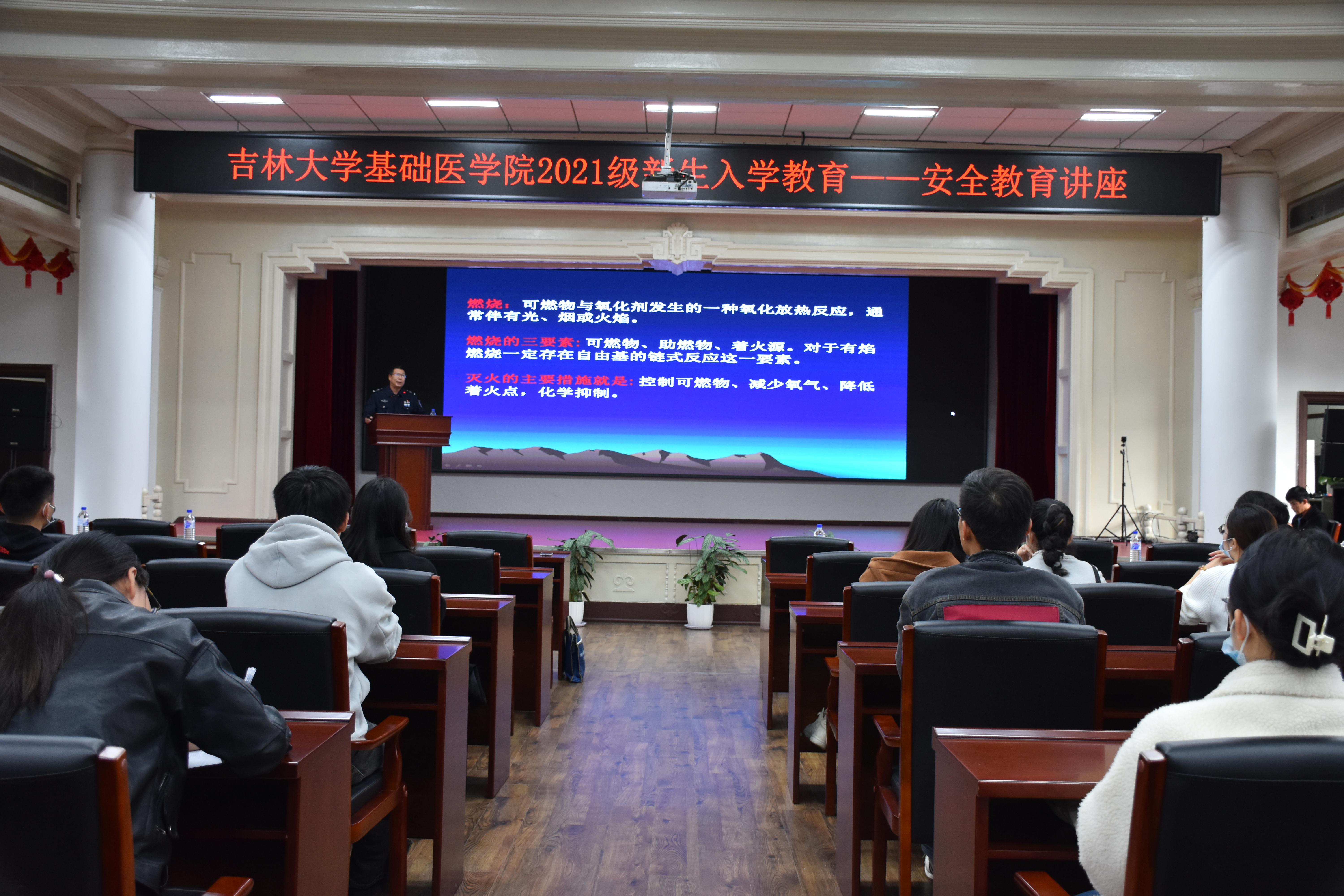 2021级新生作安全教育讲座。会议由学院综合办公室主任丁红枫主持,学院研究生工作团队及2021级全体新生参加了会议。