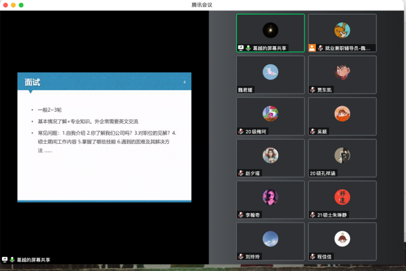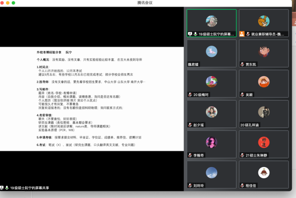 会上五位优秀研究生代表分别从升学、公考、企业、医疗事业单位四个方面为同学们带来干货满满的就业分享。考取山东大学博士的阮宁从个人概况、考博时间、选导师、考试形式等方面为大家分享了考博经验;签约江西定向选调的刘玲玲从选调生政策了解、招考一般流程、考试科目及成绩核算、笔试行测备考、笔试申论备考、面试备考等方面为大家分享了公招考试经验;签约著名药企药明康德的葛越从获取招聘信息、投递意向岗位、面试等方面为大家分享了入职公司的经验;入职西安交通大学第一附属医院的唐榕从信息获取途径、考核内容方面为大家分享了医院招聘的经验;签约黑龙江定向选调省直岗位以及济南某三甲医院的香港色情片