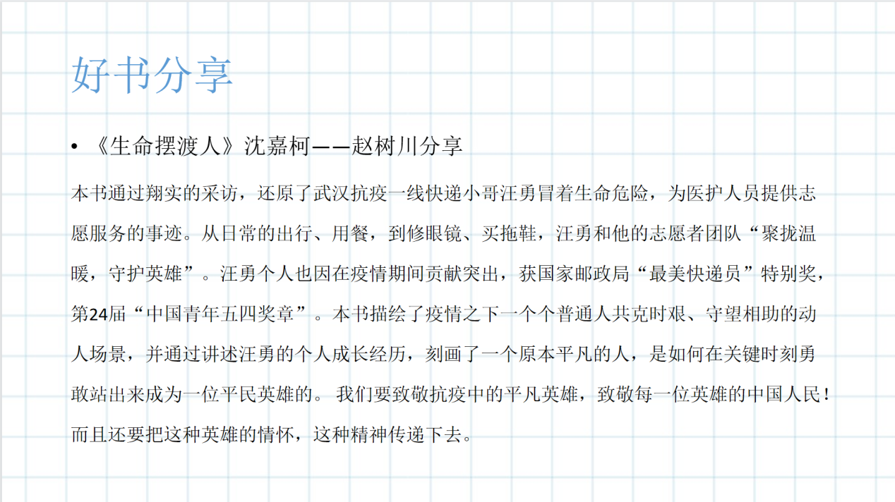 本次线上读书会主要分为三个部分。第一部分——了解历史。李垚同学带领大家一起了解世界读书日的由来,世界读书日全称为世界图书与版权日,又称世界图书日,设立目的是推动更多的人去阅读和写作,希望所有人都能尊重和感谢为人类文明做出过巨大贡献的文学、文化、科学、思想大师们,保护知识产权。第二部分——好书分享。赵树川同学首先介绍了沈嘉柯的《生命摆渡人》,书中作者记录了汪勇的事迹,还有他的志愿者团队那些勇敢的伙伴们。我们要致敬抗疫中的平凡英雄,致敬每一位英雄的中国人民!而且还要把这种英雄的情怀,这种精神传递下去;王霖云同学分享了东野圭吾的《解忧杂货店》,通过一个个温暖人心的故事,告诉大家我们并非一事无成,你可能也是某个人的黑夜中的白光,而且有无限可能;刘丹丹同学带来了季羡林先生的《时间从来不语,却回答了所有问题》,其间传递出季羡林先生百年参悟的人生观和价值观。有对时间流逝的坦然,对人生意义的思考,对社会现象的看法,对真实自我的表达以及对人间真情的热爱。第三部分——经典朗诵。读经典,横跨时间,纵跨人群,经典的书永远不会过时。同学们朗诵了《假如给我三天光明》、《纪念白求恩》、《匆匆》、《时代》、《可爱的中国》节选,倡导大家珍惜眼前、学习白求恩精神、思考人生的价值,回味时代,增强大家的爱国热忱。