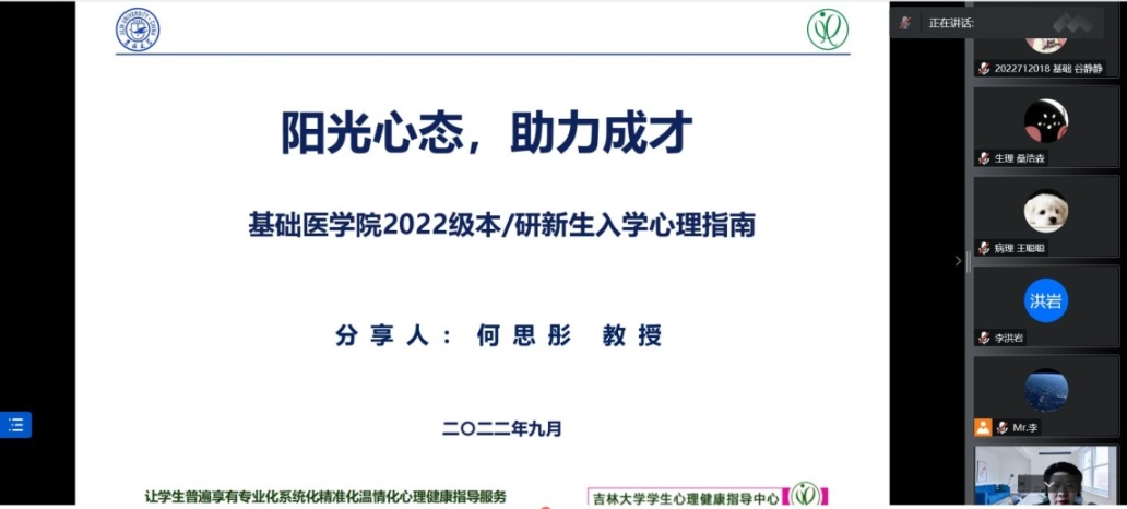 何教授所讲授的主题为《阳光心态,助力成才》,从健康和心理健康、学生心理健康影响因素、心理健康促进策略三方面帮助同学们梳理心理健康的重要性。通过讲述生活中的现象,解析身心的相互促进、相互影响,倡导同学们做自己心理健康的第一责任人,并详述了心理问题、心理异常等的区别。随后她列举了学生的心理健康影响因素及心理健康促进策略。
