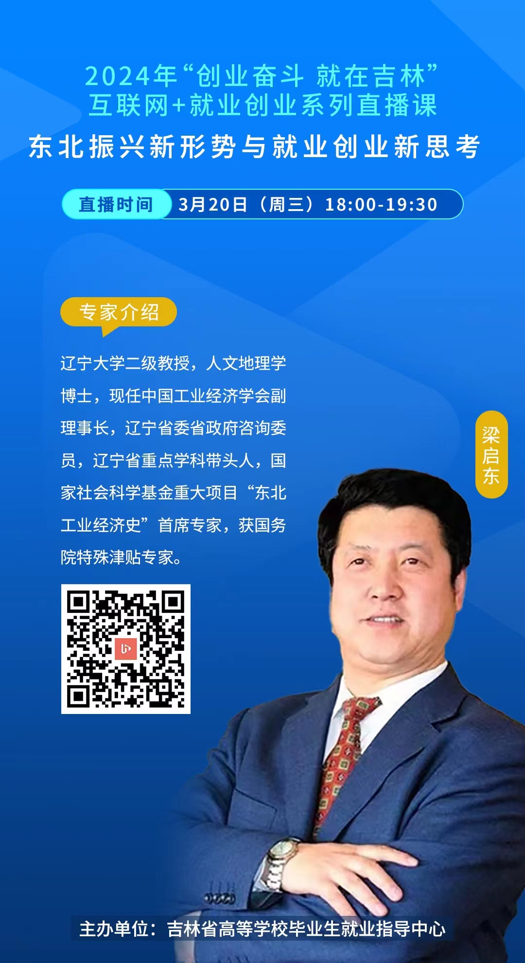 就业指导服务中心要求,鼓励各个年级同学于3月20日18:00准时收看2024年“创业奋斗 就在吉林”互联网+就业创业系列直播课之《东北振兴新形势与就业创业新思考》网络直播课程。