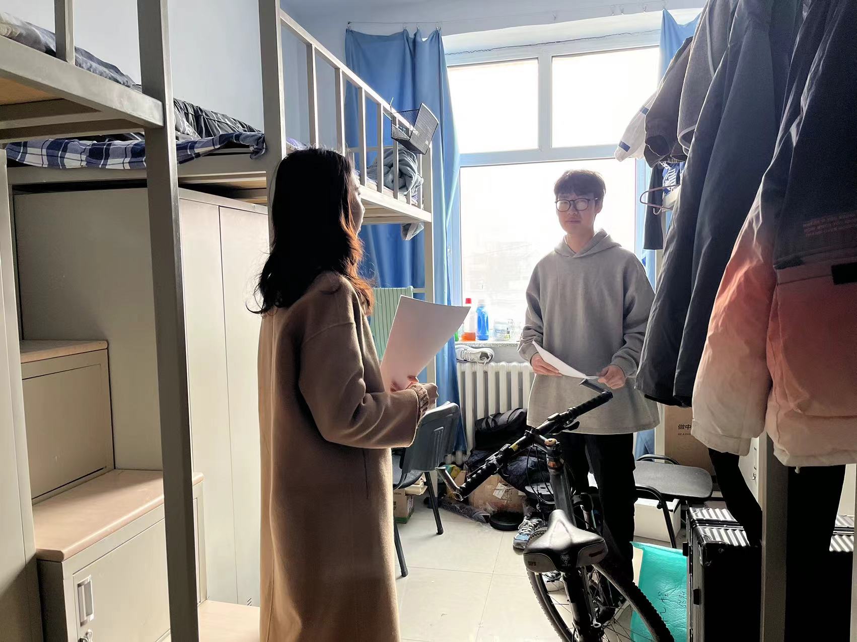 在检查过程中,孙老师提醒研究生们要注意用电安全,绝对禁止使用违禁电器。检查还包括查看是否存在违规存放电动车、非法充电行为以及离寝时未断电的问题。此外,老师还向同学们强调了在宿舍堆积存放废旧书籍、纸箱等易燃物品的危险性,并明确禁止在寝室内抽烟或进行任何明火行为。同时,也提醒同学们要注意保持寝室卫生,营造一个安全舒适的居住环境。同学们都表示会积极遵守学校相关制度。