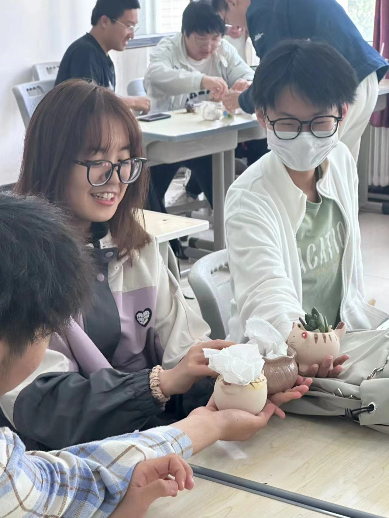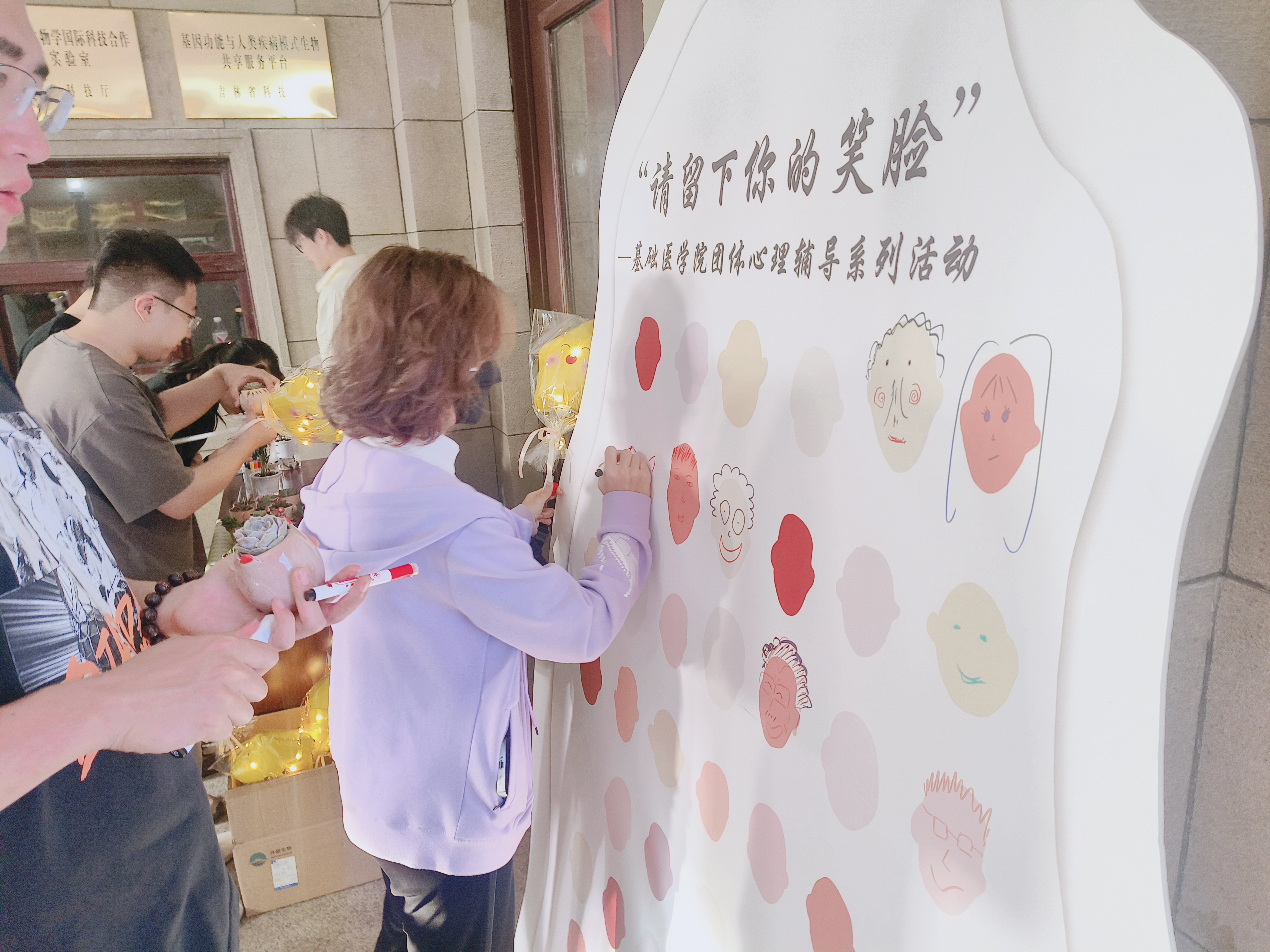 的每一位同学。活动分为三个环节,在第一个环节心情笑脸展览板活动中,同学们纷纷画出自己或身边人最真实、最具感染力的笑脸照片,这些笑脸照片将以艺术化的方式布置在展览板上,形成一幅幅生动活泼且温暖人心的画面。同时,这也是一种无声的情感交流,让同学们在欣赏他人笑脸的过程中感受到来自同龄人的力量和支持,进一步强化了同学们的凝聚力和归属感。接着进入到绿植领养计划环节,同学们在实际操作中享受到园艺的乐趣,同时也孕育出对自然的尊重和爱护之情。最后,活动进入到鼓起勇气,把星星打包带走这一环节,同学们制作星星气球,并用灯带加以装饰。每颗星星都承载着个人的独特故事和情感寄托,当它们被同学们高高举起时,形成一片璀璨夺目的“星辰大海”,以此鼓励彼此勇敢展现个性,同时也教会他们在面对挑战和困难时,要像抬头仰望星空一样,保持坚韧不屈的精神面貌。