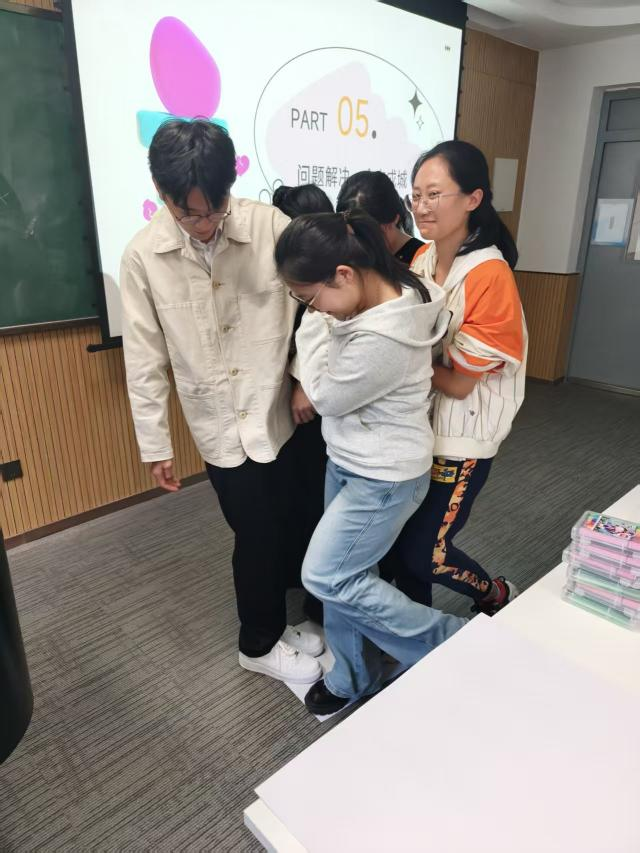 活动伊始,“一分钟鼓掌” 游戏拉开了序幕。在朋辈心理辅导员的引导下,新生们先预估自己一分钟内能够鼓掌的次数,随后全身心投入到鼓掌环节中,也以一种充满激情的方式迅速融入了活动氛围。接下来的活动则是充满了趣味与挑战的团体游戏环节,包括“我知道” 自我介绍环节,“人体字母”、“众志成城” 等团队协作环节,以及“快乐传递”、“我爱我班”、“绘制团体树”、“相亲相爱一家人”等走心互动环节。通过游戏的进行,同学们不断熟悉彼此、发现彼此的闪光点,活动现场的氛围不断被带动、被点燃。