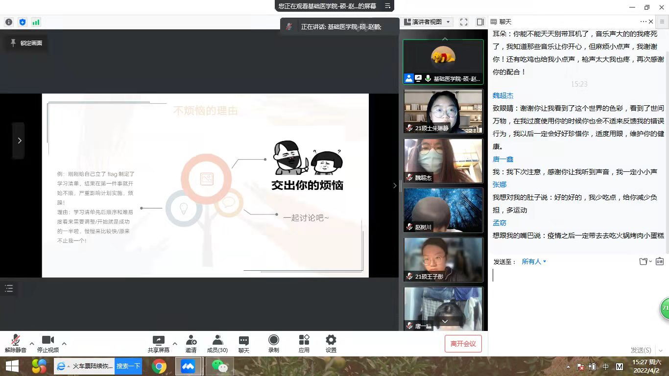 开展了“心灵沟通”主题班会,学院全体研究生齐聚线上,共话“心”事。