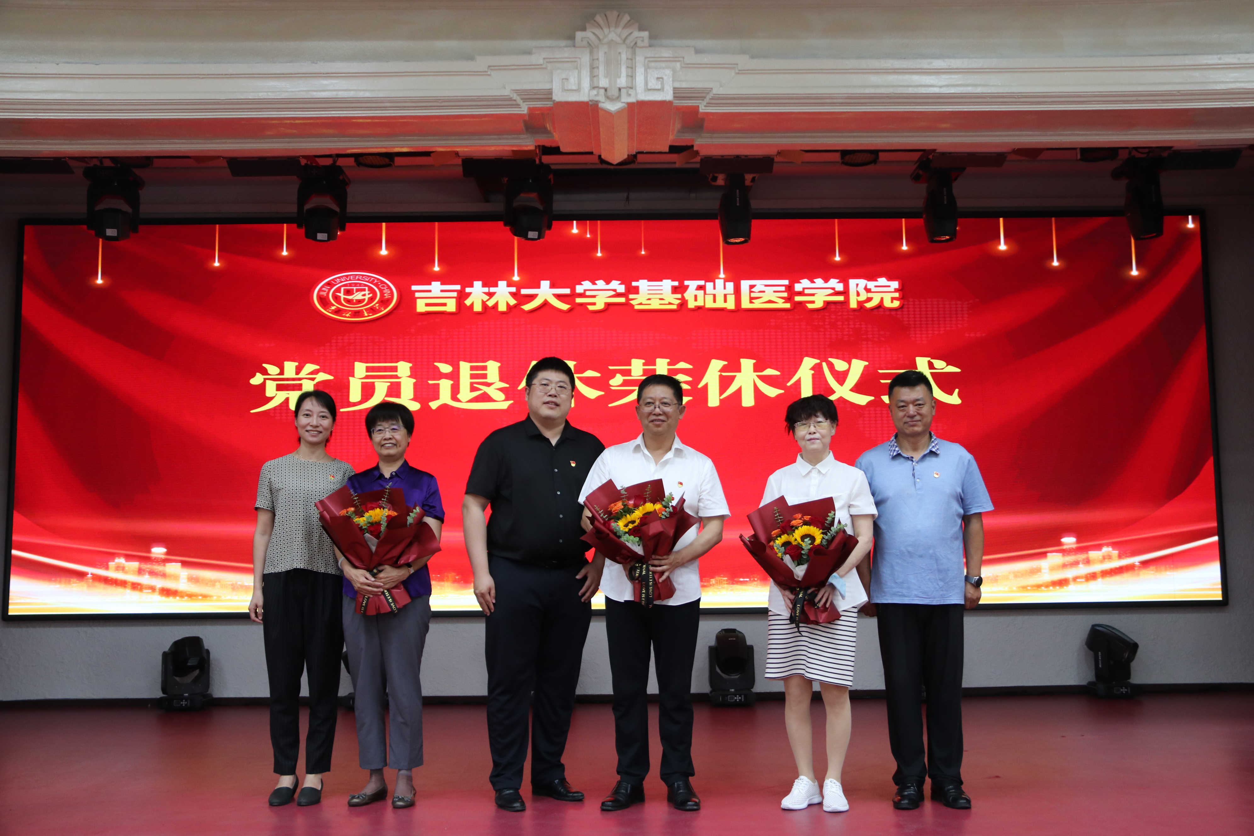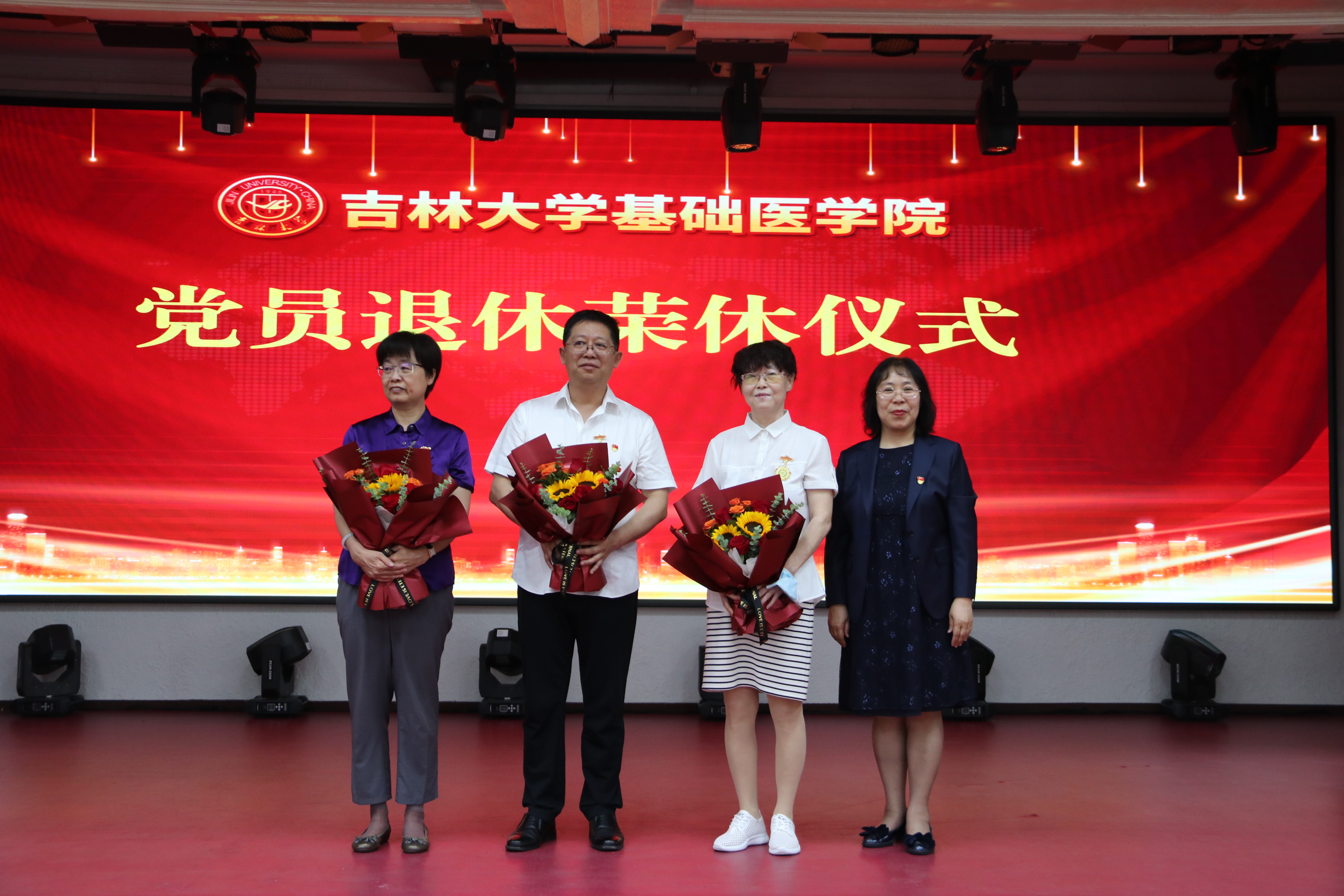 党员退休荣休仪式。退休党员所在支部分别为三位退休党员送上献花,党委书记王晓荣为退休党员颁发学院党委特殊制作的党员荣休纪念章。