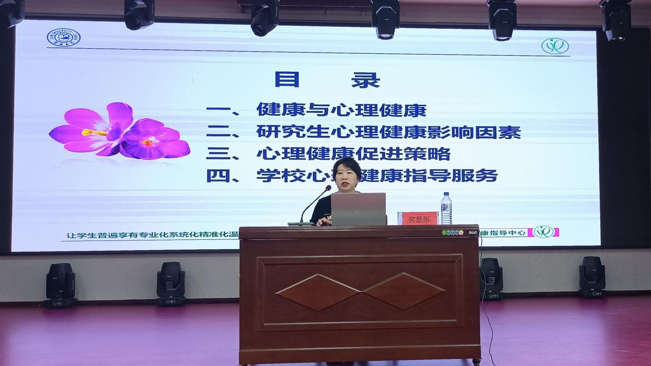 何思彤教授从健康与心理健康、研究生心理健康影响因素、心理健康促进策略和学校心理健康指导服务四个部分向同学们进行心理健康知识的普及。她详细讲解了心理健康的概念、心理健康的等级,列举了影响研究生心理健康的因素,包括人际交往、恋爱婚姻、学习压力、专业兴趣、就业压力、经济困难和现实目标等。