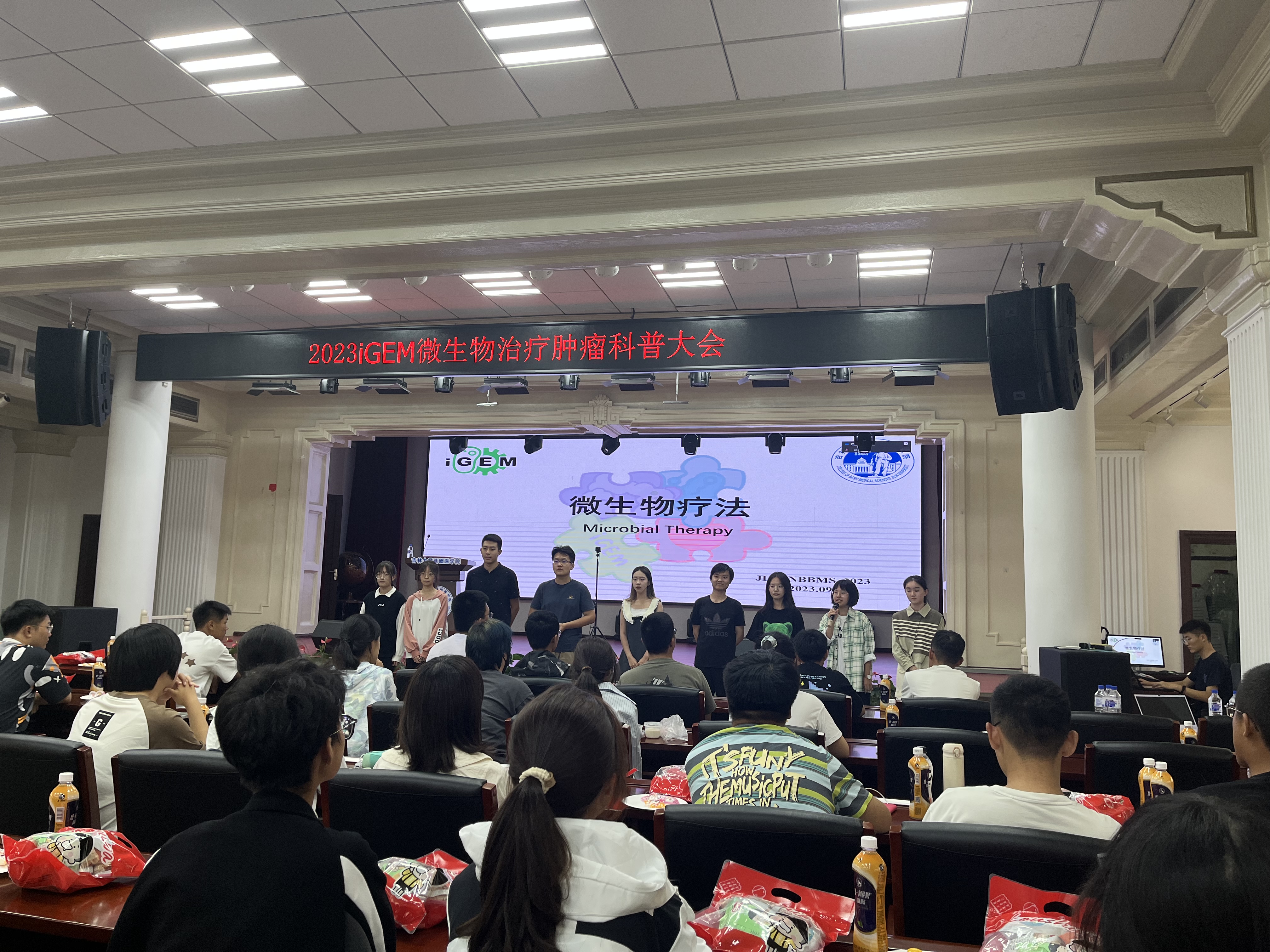 学院党委副书记李东洋,iGEM参赛团队指导教师张灵、杨明,2023级生物医学科学专业班主任辛卓远、闫天昊和全体2022级、2023级本科生共同参加了本次活动。在会上,6支iGEM团队分别汇报交流了自己团队在微生物治疗肿瘤方面开展的研究思路和研究成果。我院JLU-NBBMS团队汇报了不同微生物疗法在肿瘤治疗中的作用和相关研究成果,现场反响热烈,引发同学们争相讨论,为2023级新生同学普及了合成生物学相关知识,也了解到了前沿生物科技的发展与进步。