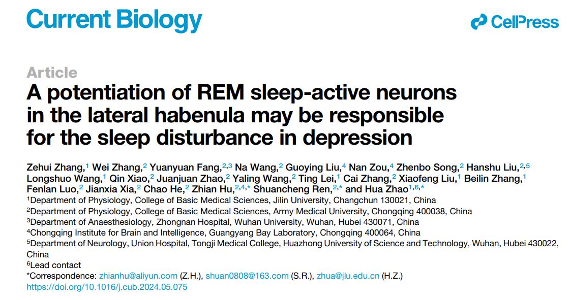 2024年6月29日,我院赵华教授团队、陆军军医大学胡志安/任栓成团队合作在Current Biology在线发表题为 “A potentiation of REM sleep-active neurons in the lateral habenula may be responsible for the sleep disturbance in depression”的研究论文。该研究证明LHb的REM睡眠活跃神经元在抑郁症所致睡眠障碍中具有不可或缺的作用,这一发现不仅确定了抑郁所致睡眠障碍发病中一个新靶点及其潜在机制,更为临床防治抑郁睡眠障碍提出了新策略。 Current Biology 是发表生物学领域研究的国际顶级刊物,中科院分区为1区的TOP期刊,最新影响因子8.1(香港色情片