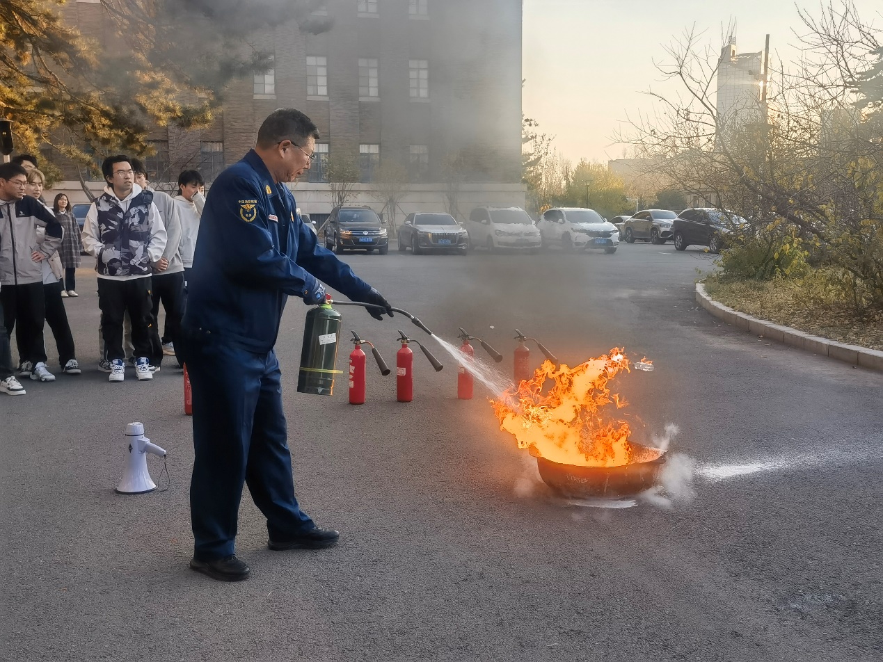 研究生辅导员孙佳钰老师向参训人员介绍,2024年11月9日是全国第33个消防安全宣传教育日,并强调了日常生活工作中消防安全的重要性和重要意义。学院结合学校当前工作要求,普及了逃生自救常识。新民校区保卫处安志成老师向大家详细演示了消防器材的使用方法,让老师和同学掌握了如何在火灾初期灭火的自救技能,进一步提高了安全防范意识。