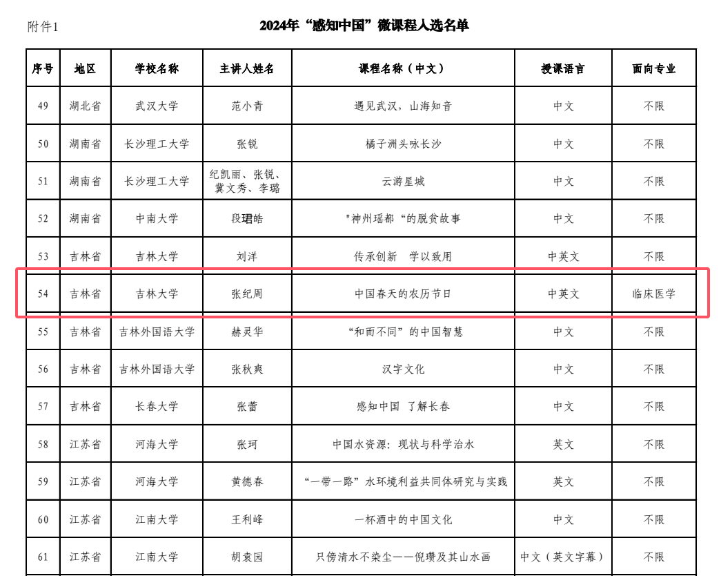 近日,国家留学基金管理委员会正式公布2024年“感知中国”微课程与实践基地入选名单,经学校推荐、专家审核,全国共有151个作品入选2024年“感知中国”微课程。其中,由我院MBBS医学汉语课程授课团队的张纪周副教授作为主讲人申报的作品—《中国春天的农历节日》,成功入选本次微课程项目。