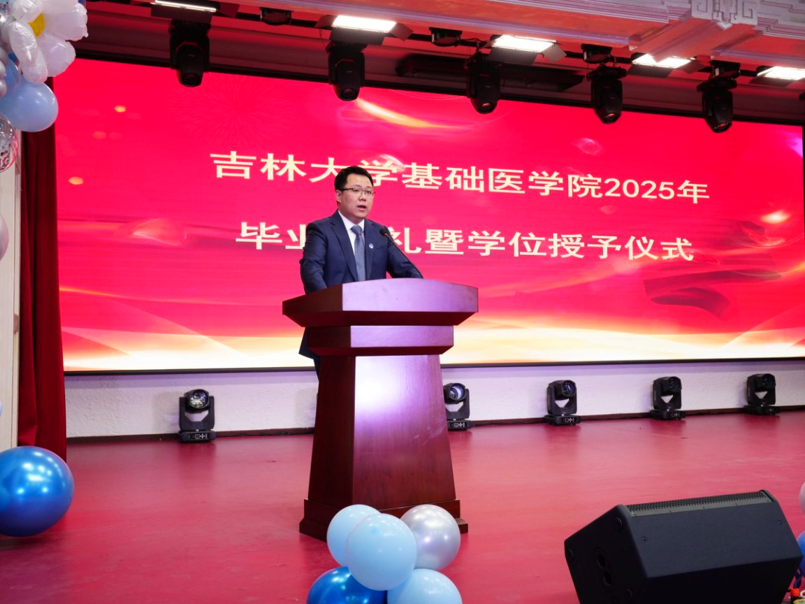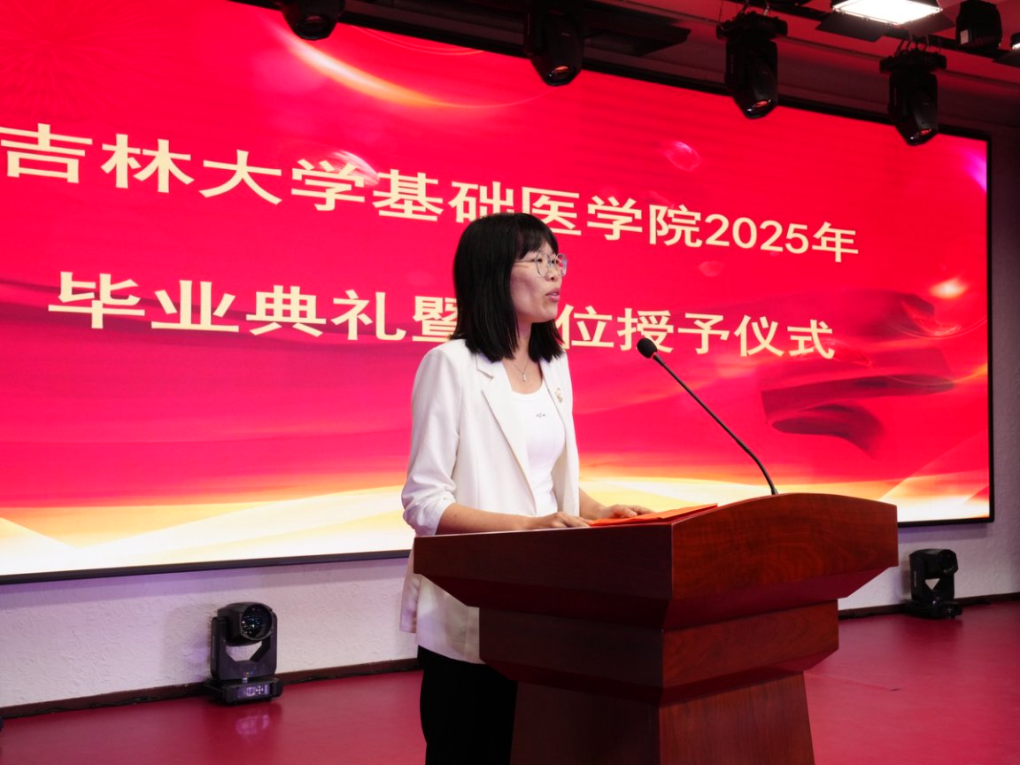 教师代表徐彩娜老师发言,首先对毕业生表达深深的祝福,祝贺毕业学子成功穿越学海,抵达梦想的彼岸!而今天,毕业并非学习的终点,而是意味着毕业学子将正式开启人生的“实践模式”与“贡献模式”,将带着“基础医学”赋予的扎实根基,自信地迈入人生的“证明”阶段。未来,无论是继续在科研的深海中探索未知,在临床的阵地上守护生命,还是在更广阔的领域施展才华,都期待毕业学子将所学所感,转化为服务国家、推动社会进步的实际力量,用行动去证明你们的价值与担当!