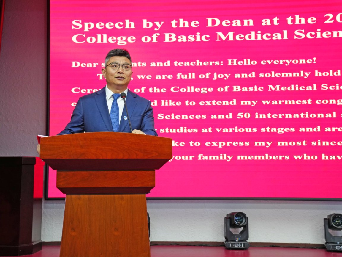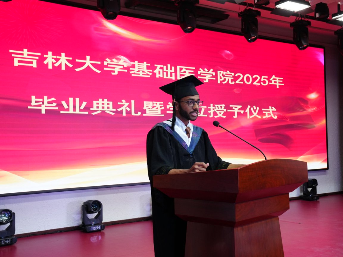 研究生毕业生代表郑皓宇发言。基础医学,是守护人类健康最前沿的堡垒,感谢学院所赋予我们的深入骨髓的医学情怀 —— 对生命的尊重,对医学真理的追求,对守护健康的责任。毕业学子将带上在这里淬炼出的品格与力量,带上那份对科学的好奇、对生命的敬畏、对责任的担当,勇敢地奔赴各自的星辰大海。