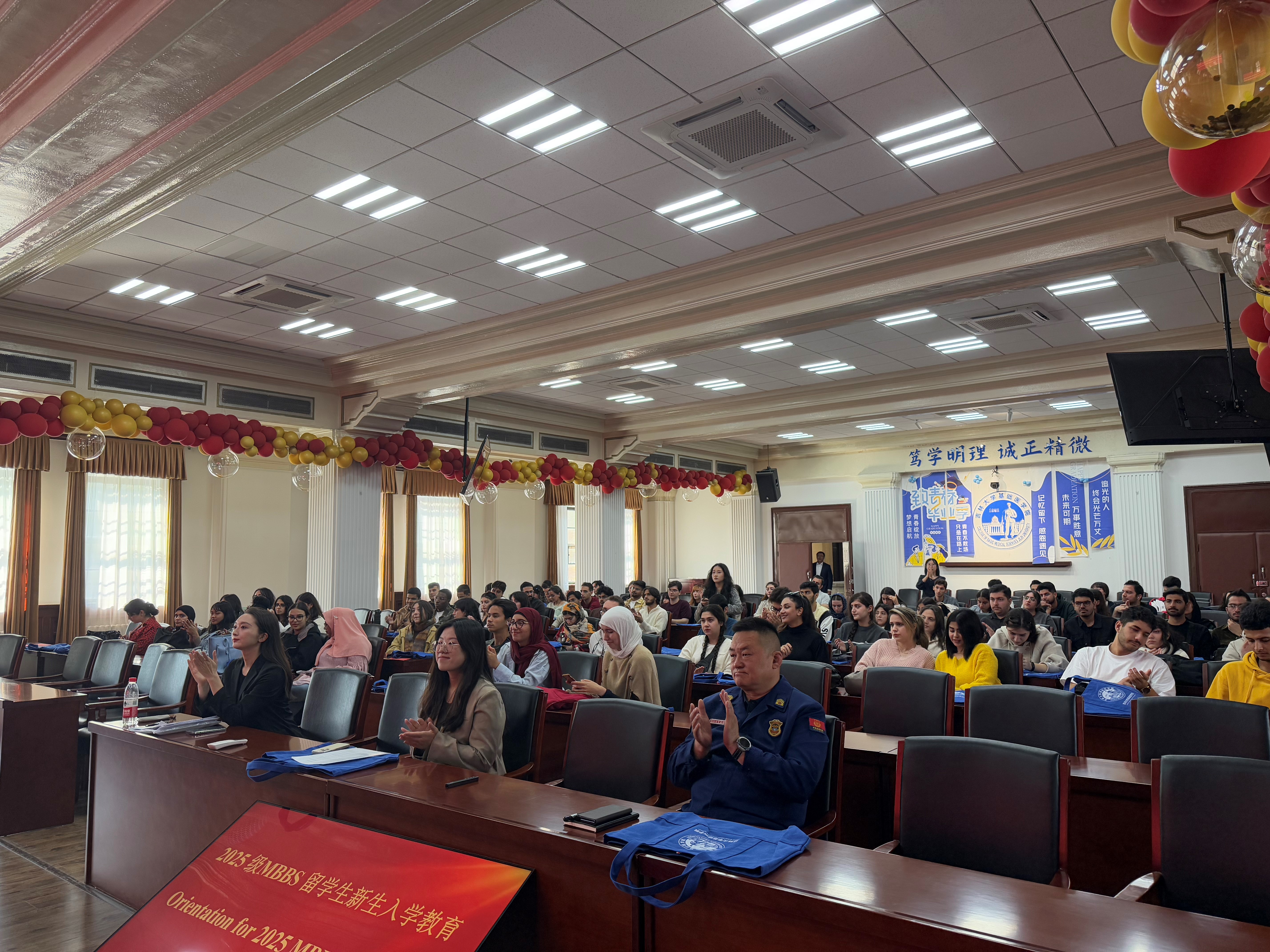 2025级MBBS留学生辅导员刘末老师解读了国际学生的入学指南、法律法规及校纪校规、保险以及签证管理等事宜。帮助新生全面了解在校学习和生活的相关政策,进一步规范和加强学校国际学生的法律法规观念和校纪校规意识,促进学生身心健康和全面发展。