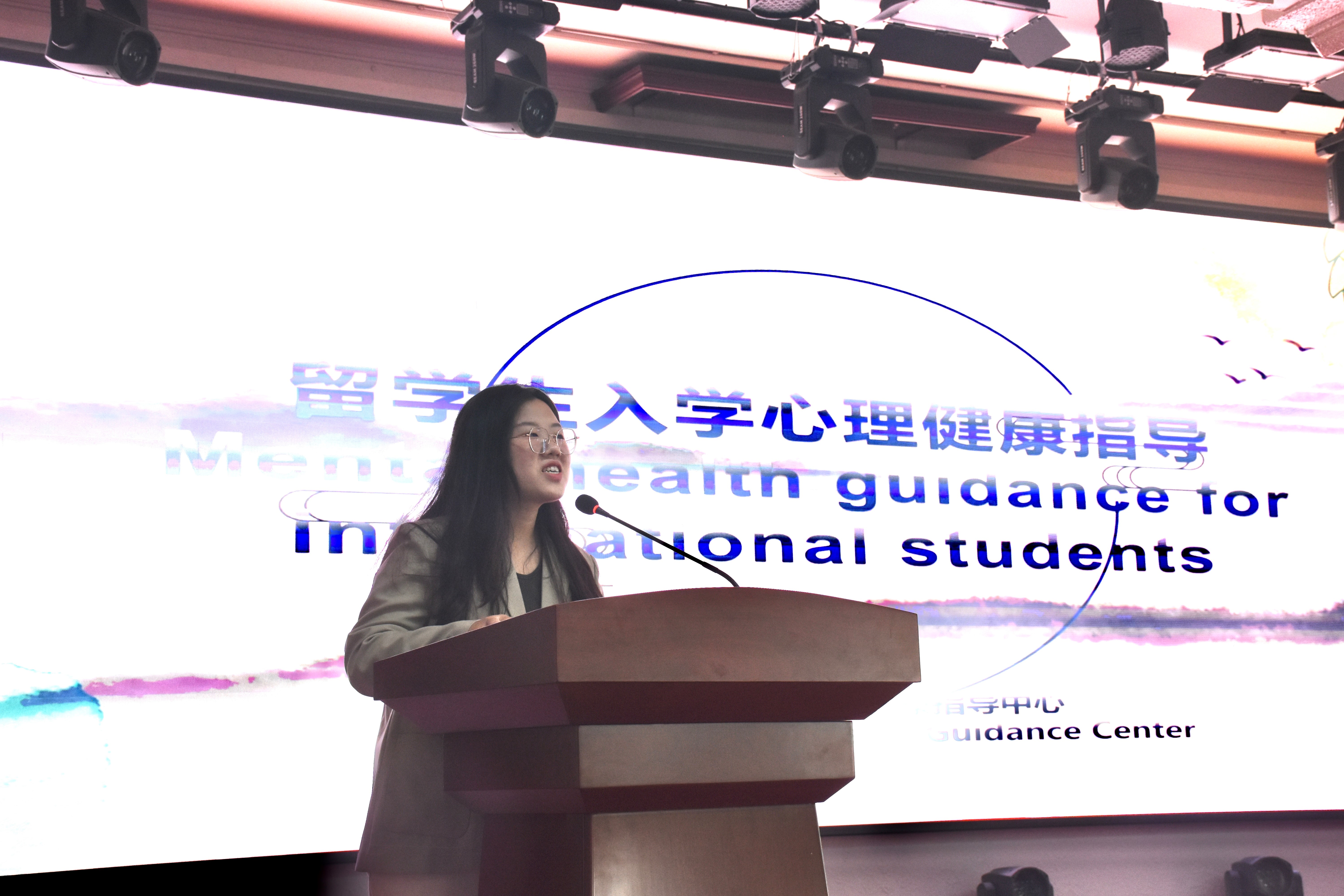 随后,学生心理健康指导中心刘宇颢老师进行了跨文化适应和心理健康讲座。她首先解读了留学生可能出现的心理困扰与原因,并对此给出了一系列心理调节策略,帮助留学生更好地适应新环境。同时,她介绍了学校丰富的支持资源,包括资深的心理健康关怀队伍、设施齐全的心理素质培训基地、便捷的心理咨询途径以及就医方式等。
