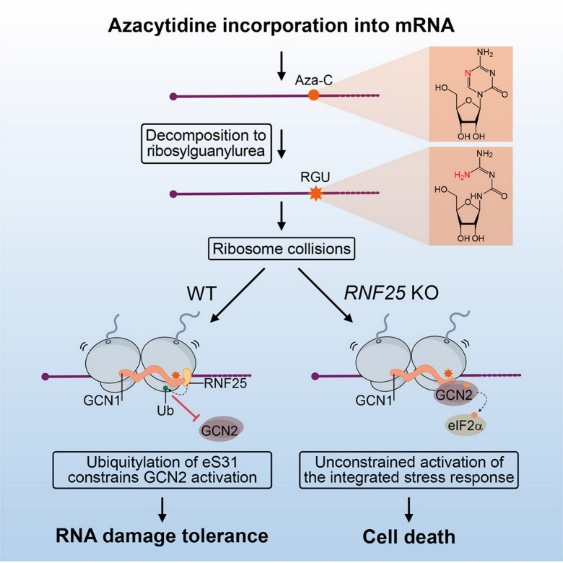 综上,该研究首次证实阿扎胞苷可通过诱导mRNA损伤并ISR发挥细胞毒性作用,同时揭示RNF25通过调控该应激通路介导细胞对阿扎胞苷毒性的抵抗机制,提出了一条新的mRNA损伤耐受调控通路。该成果不仅深化了对阿扎胞苷作用机制的认识,也表明化疗药物疗效与RNA损伤应答密切相关。相关发现为通过靶向RNA损伤应答通路以提高化疗疗效、降低毒副作用提供了重要理论依据和潜在干预策略。