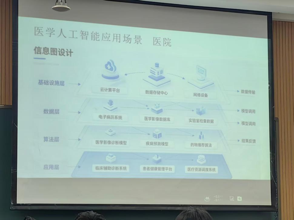 符维思经理通过医学人工智能四层架构图,系统拆解了AI医疗的底层逻辑。他指出,医学AI是由基础设施、数据、算法、应用层层支撑的复杂生态,并结合医院、医药企业等应用场景,生动解析AI赋能医疗全流程: