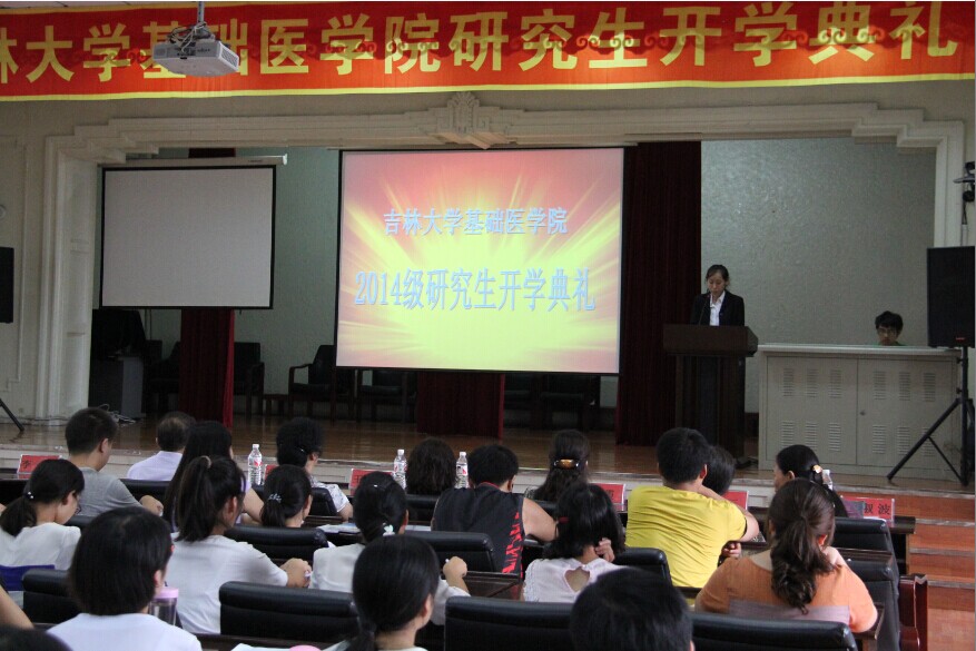 2014级研究生开学典礼及学术诚信讲座在学院二楼多功能报告厅举行。学院党委书记孙赵华、副院长李一雷等院领导、基础医学学位评定分委员会主席王丽颖、导师代表赵华、李一、王丽、台桂香等出席典礼。开学典礼由学院党委副书记费淑波主持。