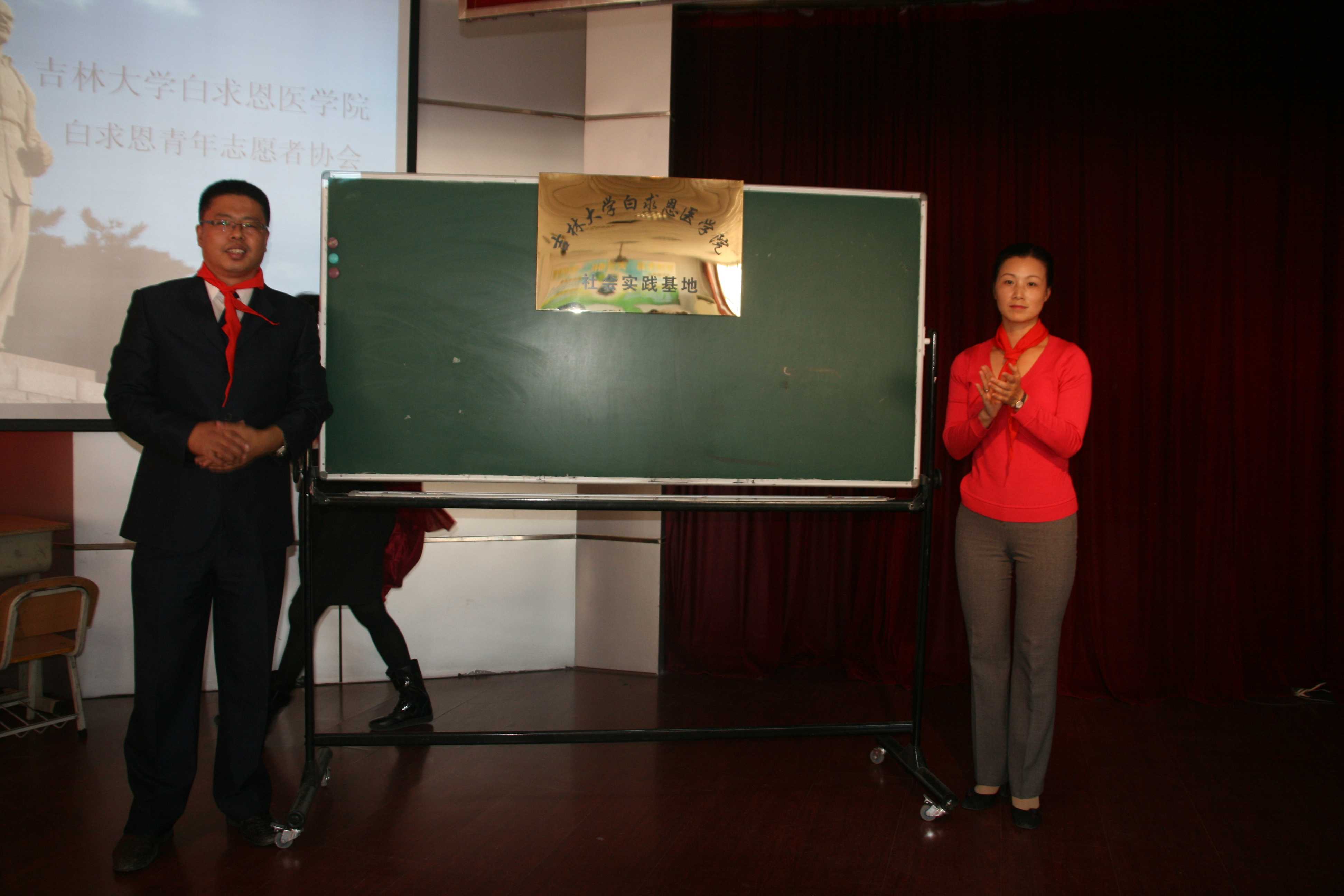 白求恩医学院社会实践基地”揭牌。最后,白求恩青年志愿者协会的志愿者们进行了首次志愿服务活动,为明德路小学学生宣讲白求恩精神并进行医学知识讲座,活动深受学生们的喜爱。