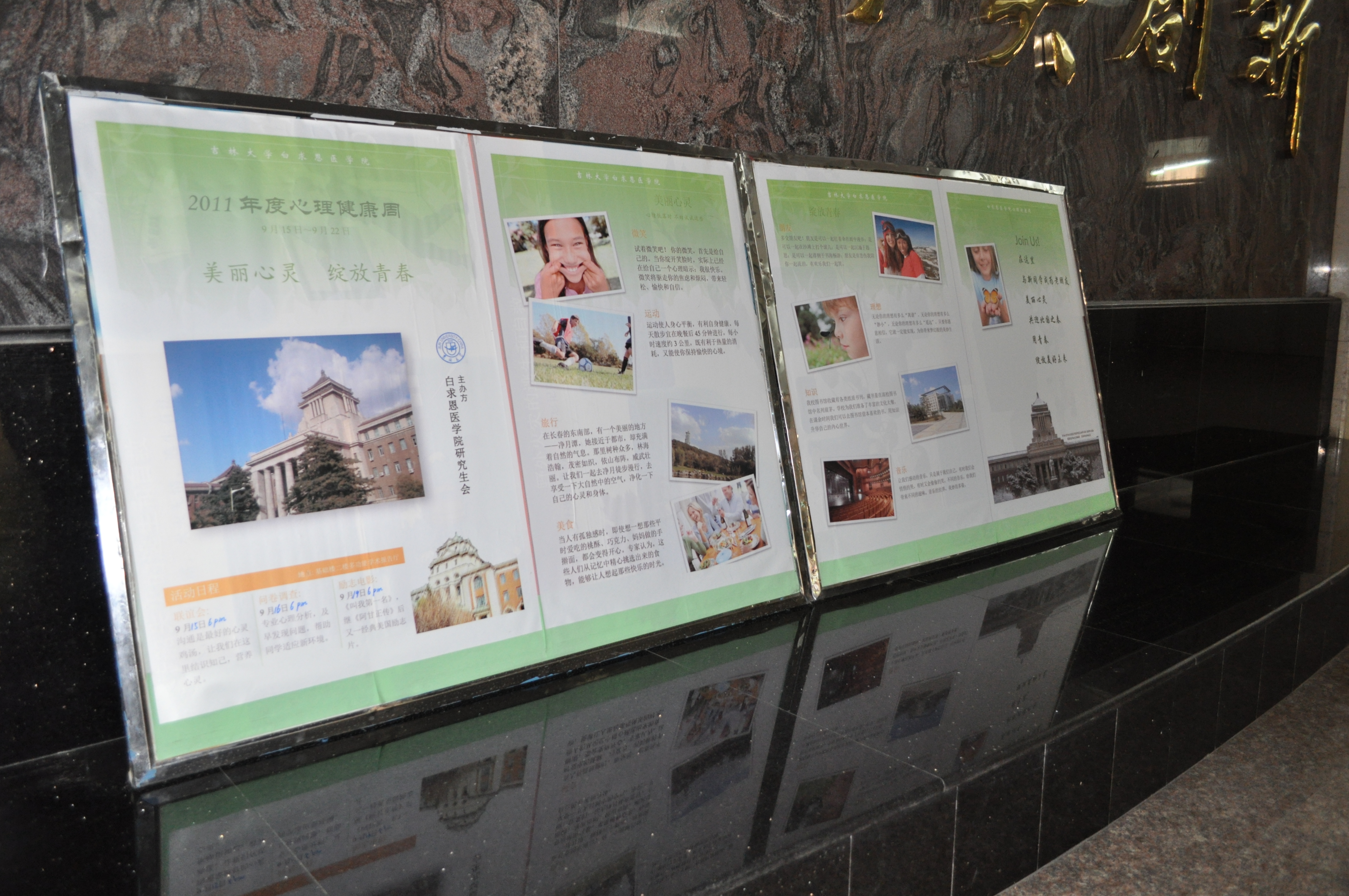 之前的一周时间里,学院研究生会在新民第一教学楼外悬挂“关注心理健康,幸福伴你成长”条幅,引起广大同学对心理健康的关注。在新民第一教学楼门厅内展出“美丽心灵,绽放青春”为主题的宣传板,列举了一系列减少心理压力、保持心灵健康的方法。同时在2011级研究生中进行“SCL-90症状自评量表”问卷调查。通过多种形式的心理健康教育,研究生新生了解了心理健康知识,掌握了必要的心理调适方法,为形成正确的心理健康观念提供保证。