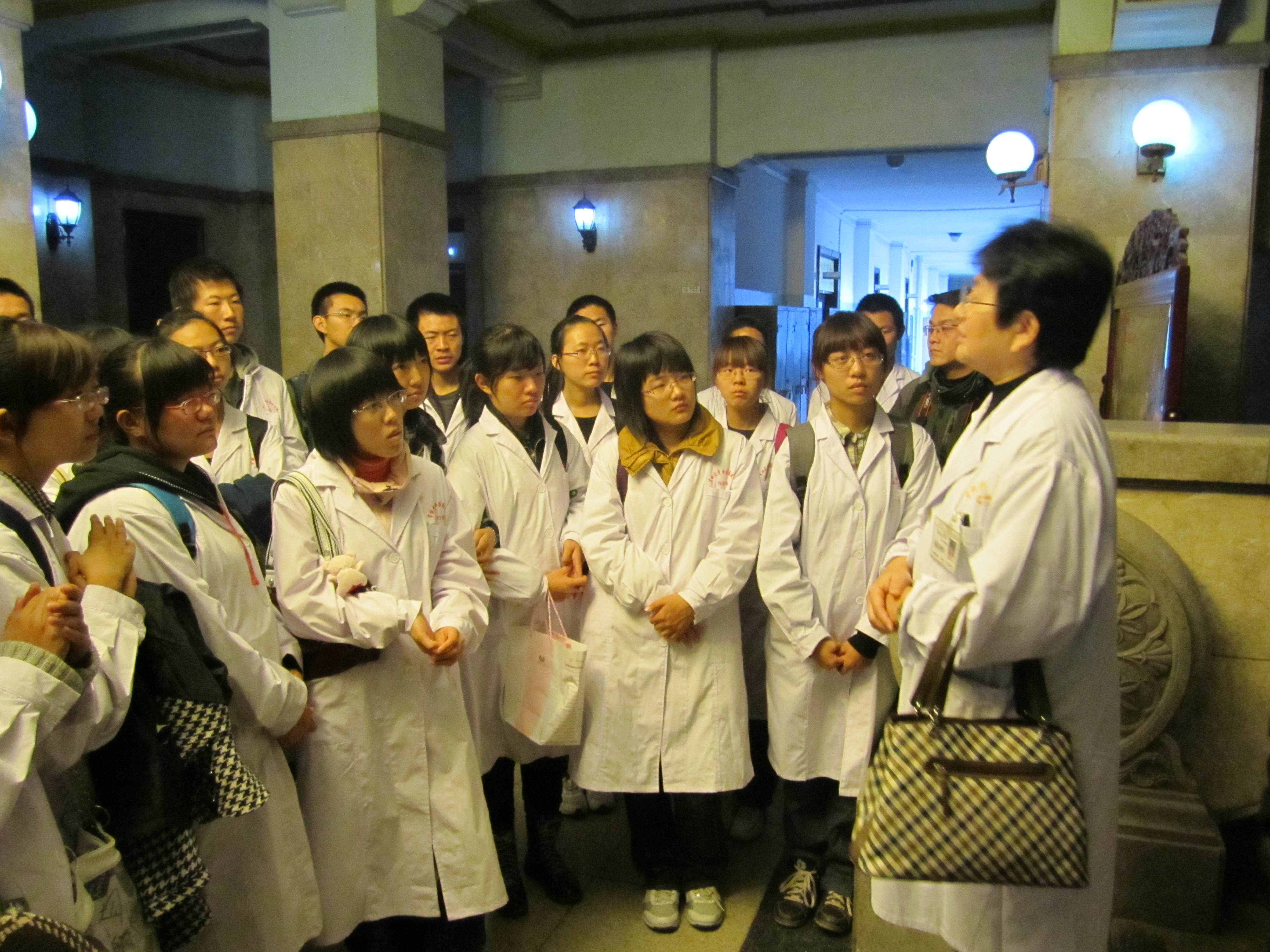 迟教授首先与同学们在伟大的国际主义战士诺尔曼·白求恩的雕像前合影。随后,同学们在迟教授的带领下参观了白求恩医学院人体解剖学系、分子生物学教研室和病理学系及部分医学标本,在各学系、教研室主任的细致讲解下,同学们更深入的了解了标本的来历、制作过程及教学作用等相关方面的知识,让这些初入医学的学生对未来的学习有了感性的认识,活动结束后,迟教授认真地为同学们作了系统的总结。