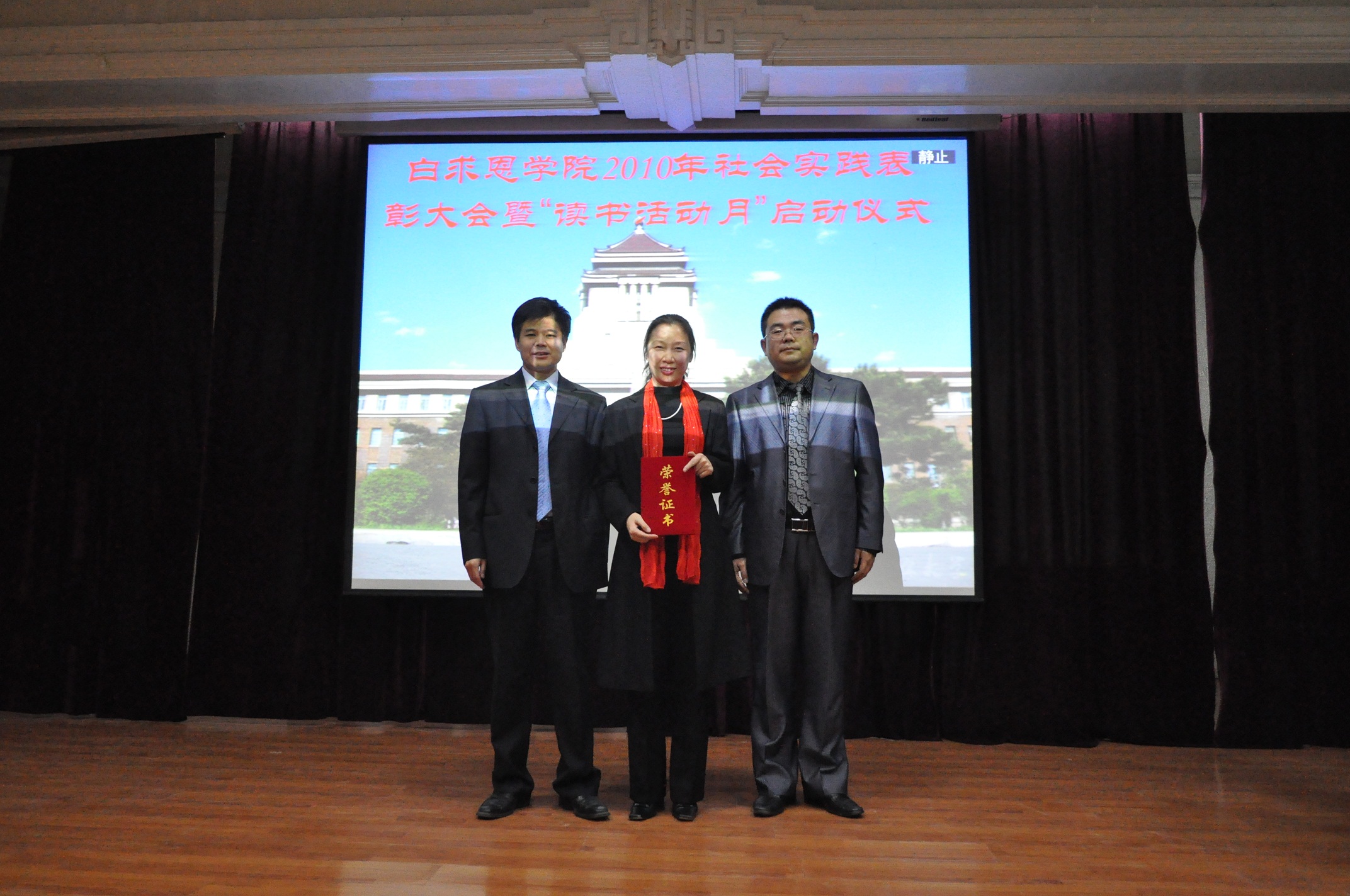 9月28日18时,白求恩医学院2010年社会实践表彰大会暨“读书活动月”启动仪式在基础楼二楼多功能学术报告厅召开。学院党委书记屈英和、副院长程丕显、党委副书记兼副院长苑锐、生物化学教研室副教授张纪周、学生工作办公室主任吴剑锋、团委书记夏燕来、辅导员秦雪及学生代表参加了会议。会议由学生会秘书长崔梦莹主持。