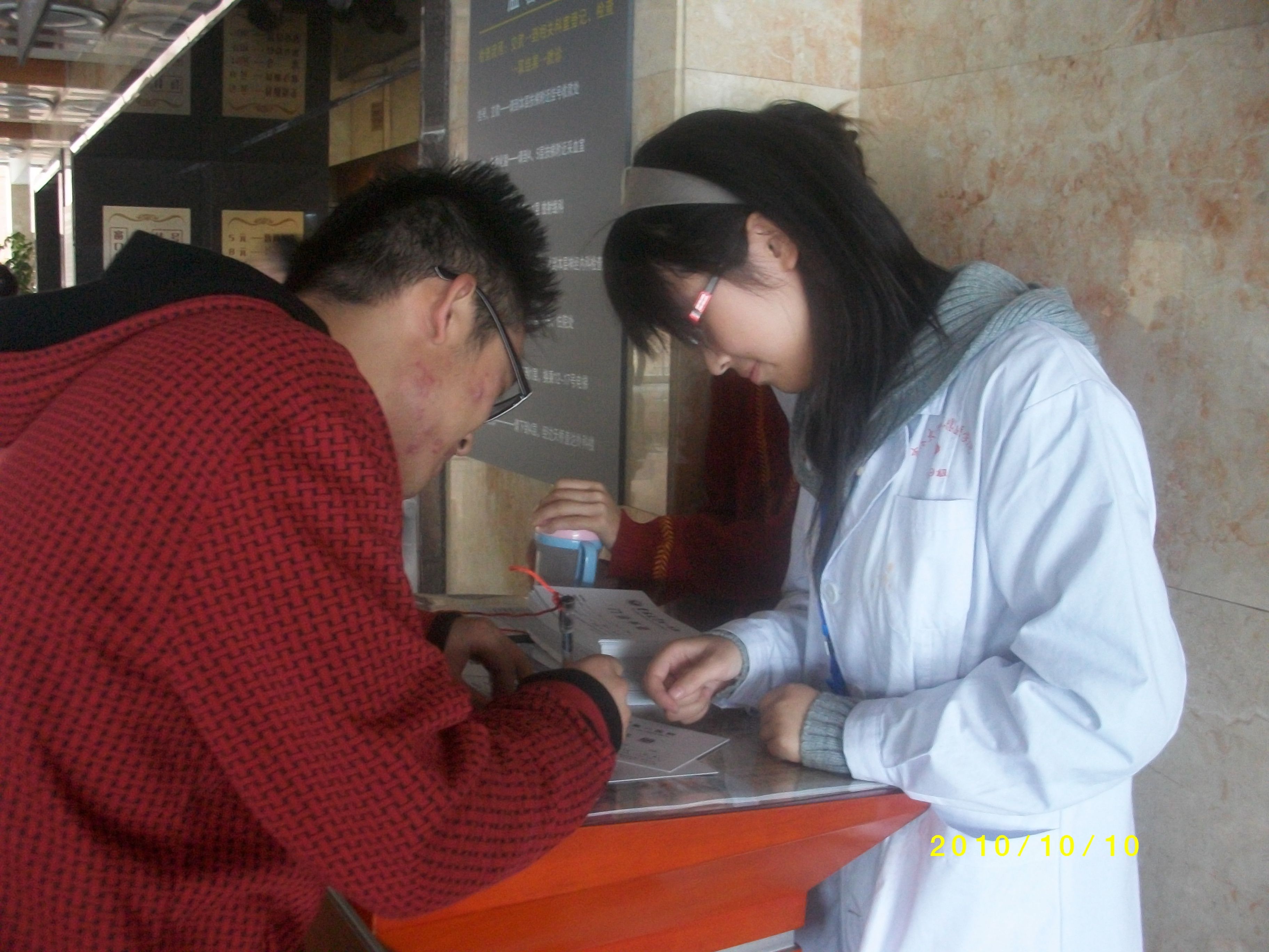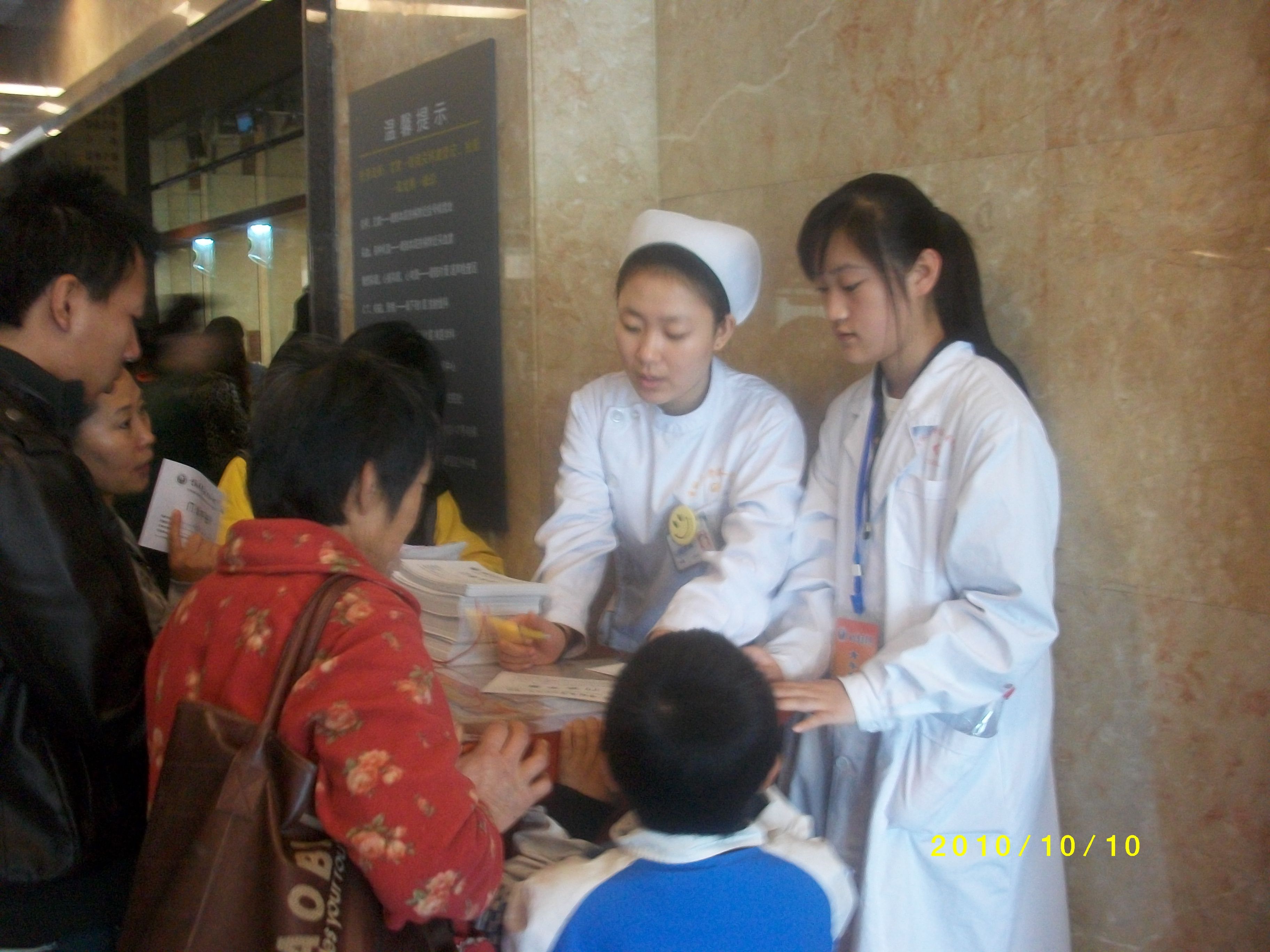 随后,志愿者们分别到门诊各科室进行导诊和分诊的服务活动。08级的林菲菲同学被分配到门诊药房做导诊,工作时,看到一个妇女抱着一个痛哭流涕的小宝宝,她朝小宝宝笑了一下,小宝宝就停止了哭泣,也露出甜甜的笑容。这让她感受到作为义务工作者笑容的重要意义。事实上,她平时并不是乐于参加各类学生活动,这次是带着对临床工作的憧憬报名的,她表示学院组织的这次活动针对性很强,第一次义工体验让她收获很大,今后有机会要多参加各类活动。09级的牟胜男同学被分配到前台大厅导诊。她的体会是:导诊是医院的门面,是患者对医院的第一印象,但同时也是最容易与患者发生冲突的地方,有时候会被辱骂,面对蛮不讲理的患者,甚至会挨打。因此导诊的工作不仅仅要有礼貌,而且面对突发事件要保持优雅的态度,还要时刻注意保护自己。08级的刘柳同学被分到妇产科进行分诊。在工作间隙,她不仅仅从医生处学习到了更多临床的知识,还更多的了解了妇产科的临床表现,将自己所学的基础知识和临床医疗进行对比与思考,加深自己对知识的了解和掌握。她说,这种义务工作为她架起了基础和临床的桥梁,让她受益匪浅。