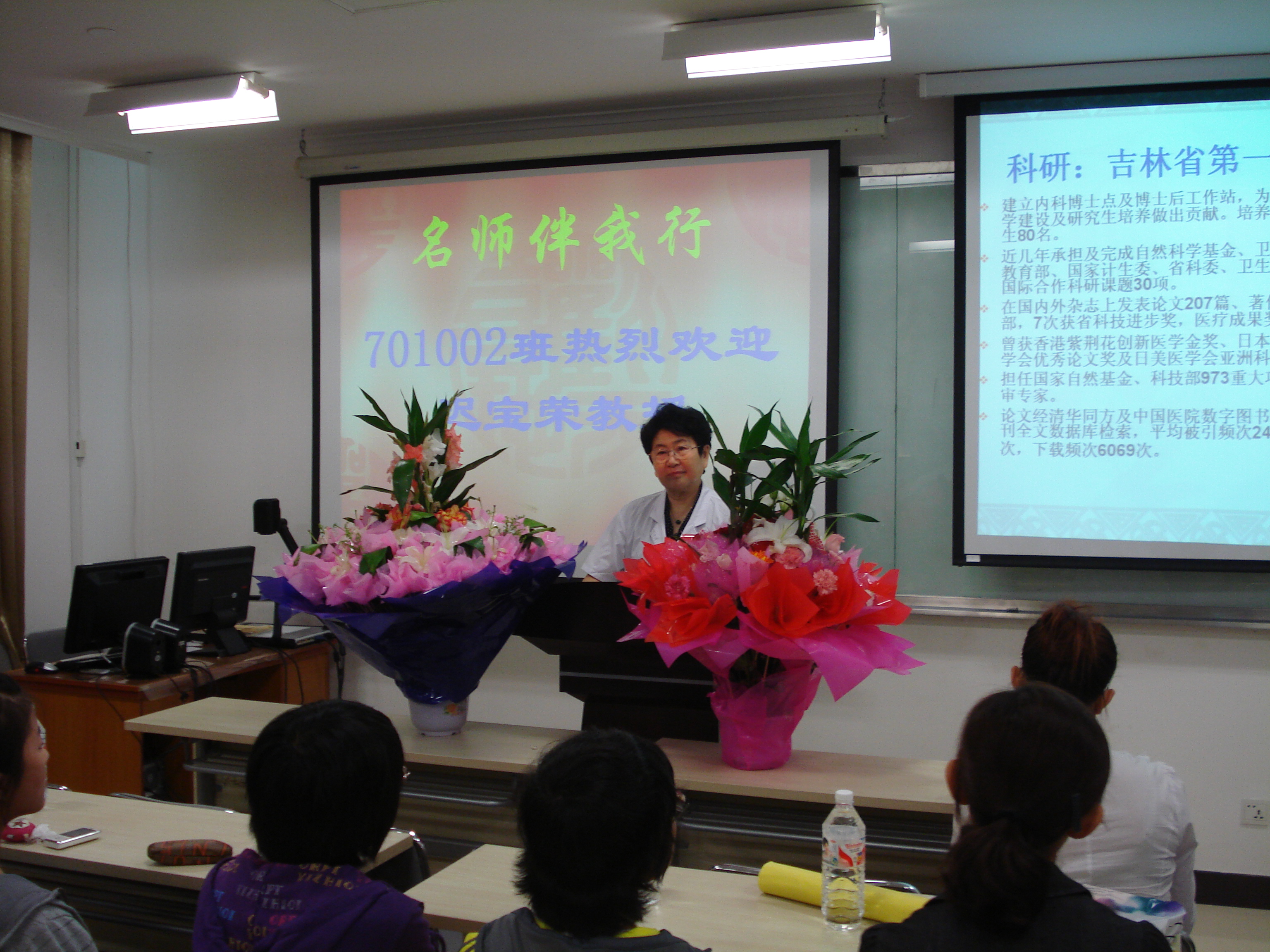 参观结束后,迟教授与同学们在肝胆胰内科教室举行了以“名师伴我行”为主题的班会。迟教授叮嘱大家在大学里要刻苦学习、珍惜时间、全面发展、健康成长。同学们一一进行了自我介绍,迟教授细心聆听、认真记录,详细了解了班级同学的生活情况。班会中同学们提出了许多问题,迟教授精彩的回答博得了同学们阵阵掌声。她说:“医生最重要的是精湛的医术以及良好的职业道德,希望同学们努力学习专业知识,提高外语水平,保持身体、心理和行为健康,快乐充实地度过大学生活!”辅导员秦雪对本次活动进行了总结,衷心地感谢迟教授对同学的谆谆教诲。学生代表王馥婧向迟教授献上了同学们精心准备的礼物。