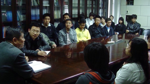 此次见面会以座谈会的形式开展。王建伟教授首先做了简短的自我介绍,表示希望做同学们的朋友,与同学们建立起一种宽松、和谐、平等、紧密的关系,并提出了会议的主题:面对就业竞争压力,增强忧患意识,提高自身竞争力。王教授用生动的例子为同学们做了精彩的讲述。
