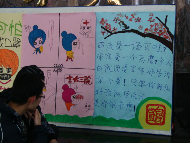 10月26日,由我院团委宣传部主办的以“甲流可防可治不可怕”为主题的海报展在新民校区第一教学楼举行。本次活动以宣传甲流知识、提高同学对甲流的防范意识和重视程度为目的,通过趣味海报、宣传标语以及讲解员现场讲解等形式,对甲型H1N1流感的传播途径和预防措施进行了介绍,使同学们更加清楚甲型H1N1流感是可防、可治、可控的,并号召所有同学积极配合学校做好有关甲流的各项防范工作。