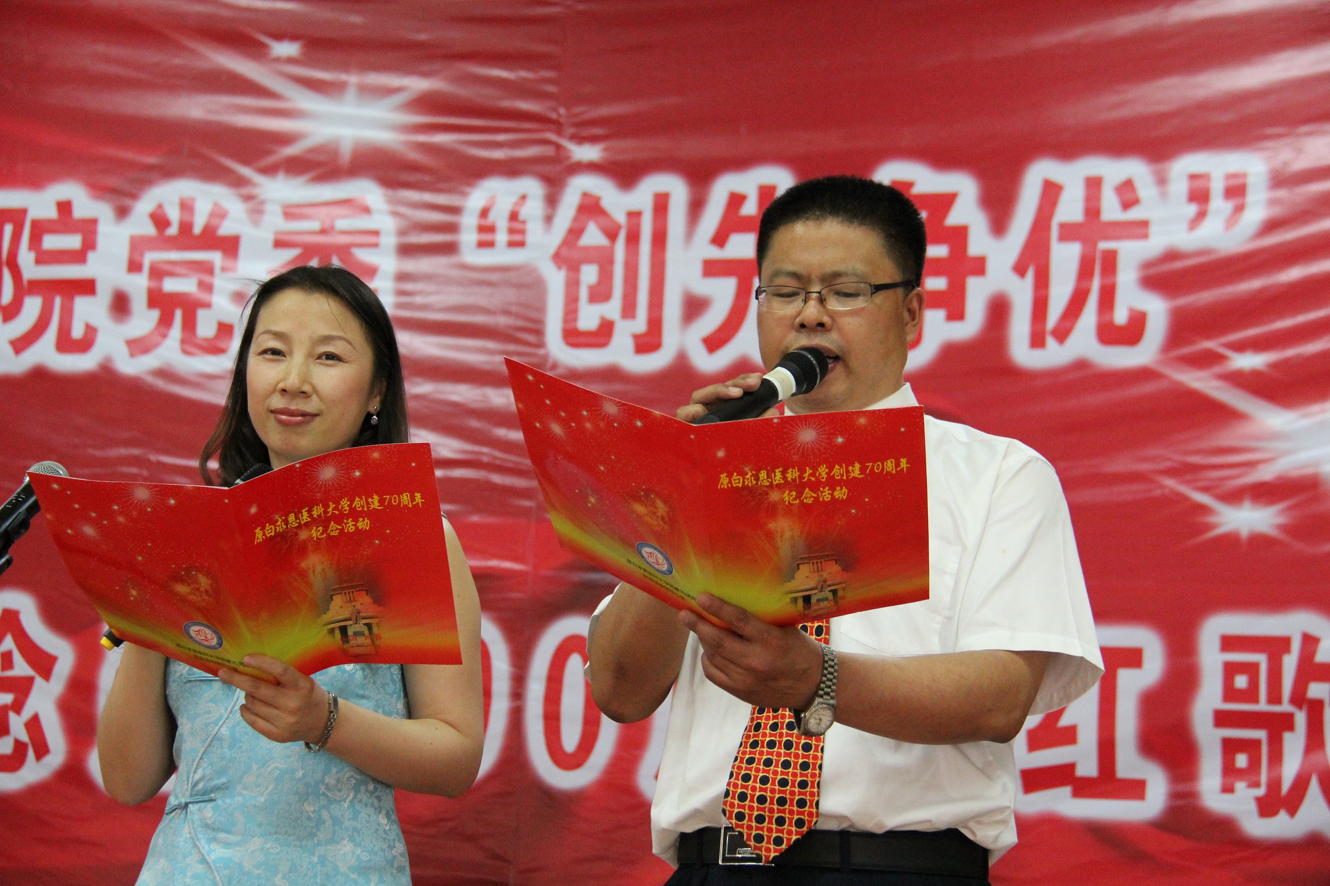 伴随着教工第一党支部《没有共产党就没有新中国》、《爱我中华》的歌声,白求恩医学院“永远跟党走”红歌会启幕,红歌会由学院学生工作办公室主任吴剑锋、生物化学与分子生物学系生物化学教研室副教授张纪周主持。教工第二党支部的《走进新时代》、第三党支部的《打靶归来》,第四党支部的《军民团结一家亲》、第五党支部的《歌唱祖国》、《中国、中国,鲜红的太阳永不落》,第六党支部的《祖国万岁》、第七党支部的《英雄赞歌》、《我们走在大路上》,字字句句饱含着对党的无限忠诚与热爱,点点滴滴折射出医学院教工党员的良好精神风貌。第八党支部的《今天是你的生日,我的中国》在兰恒斌、于传波、申桂香的热情参与下赢得了持久而热烈的掌声,红歌会在高潮中圆满落幕。