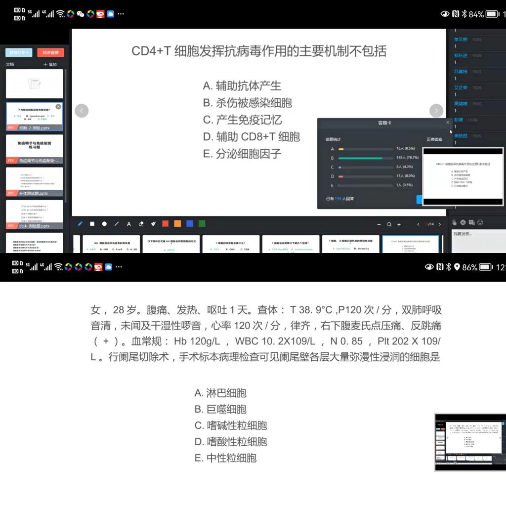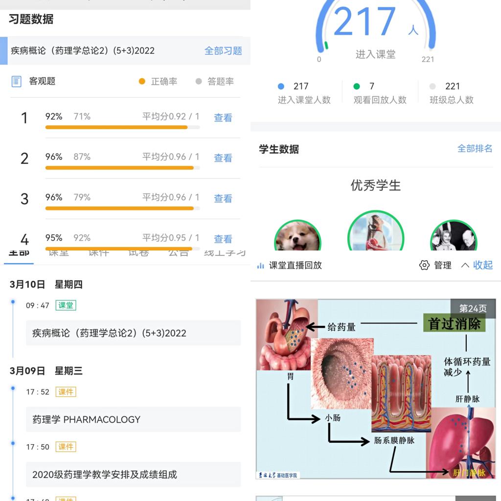 共计承担专业基础课程44门次,总学时2476学时,选课学生达6455人次。面对突然的教学模式的转变,各学系按照新学期提交的应急预案及时启动在线教学方案,稳步推进既定的教学进程,本次线上教学多采用超星学习通在线直播的方式,并随堂实施主题讨论、测试、讨论等教学活动,师生在线上体会了真正的“互动”。此外,经过与上海梦之路虚拟软件平台沟通,开放了341项基础医学类实验项目,作为教学补充资源供师生使用。