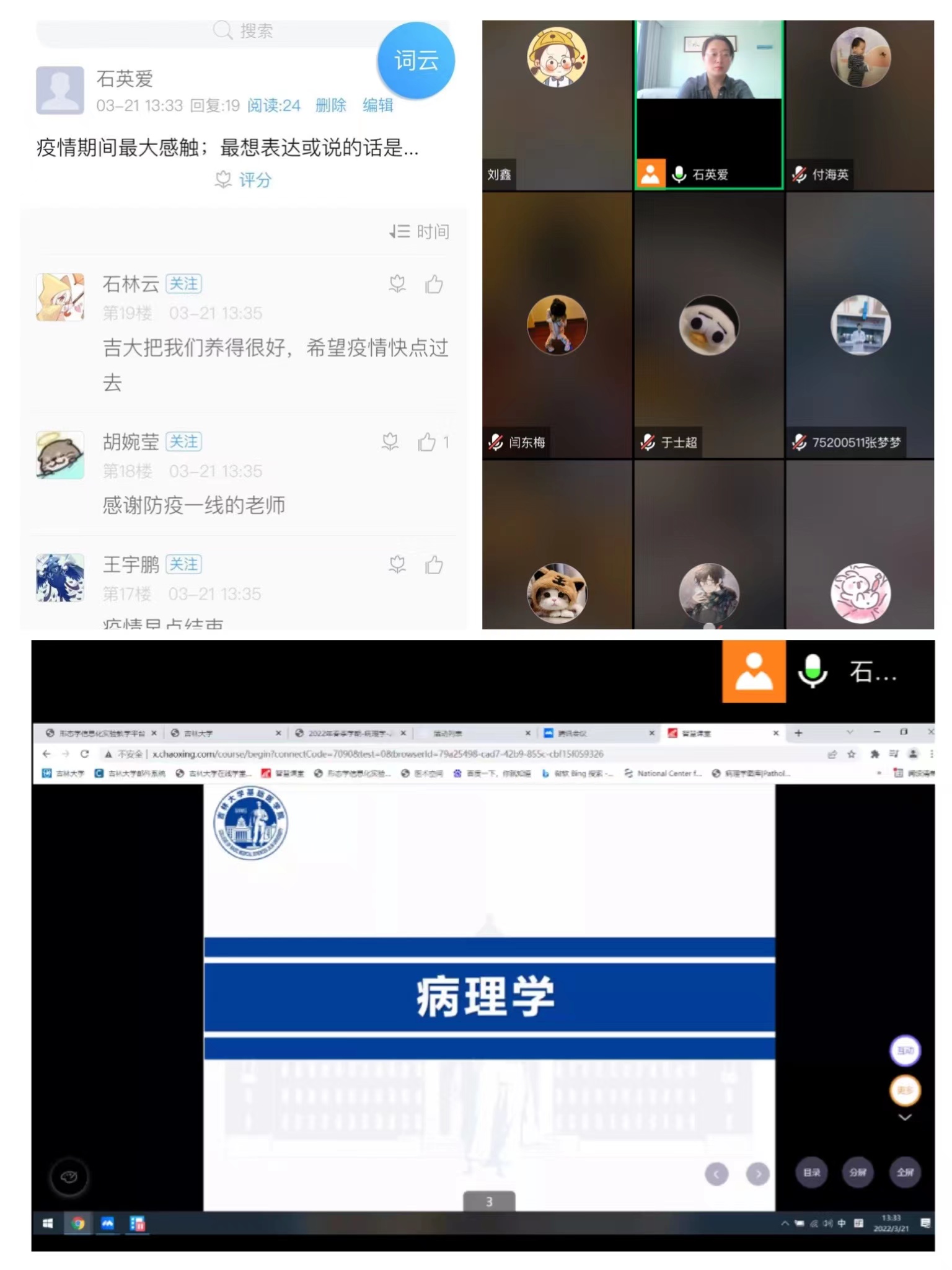 病理学实习课线上教学观摩选择的是石英爱老师讲授的“细胞和组织的适应与损伤”,上课伊始,石老师为各位同学和老师展示了一段吉大优秀学子制作的抗疫合唱视频,鼓励学生要坚信春天一定会很快到来;接着石老师通过病理学系建设完成的形态学数字化教学平台和虚拟实验资源指导学生在云端观察3D大体标本和数字切片,同时通过设计抢答、问答、学生展示等多项互动,调动学生的学习积极性;除此之外,还向参与观摩的老师展示了形态学线上实验的授课安排以及教学设计。在线上教学观摩的基础上,病理学系李艳茹老师又为学院的老师呈现了一场“基于两端三平台的病理学实验课线上教学的设计与实施”的经验分享,李艳茹老师以自己的授课经验为切入点,介绍了学系对于线上实验教学的前期准备工作,并分享了对于“两端三平台”的多维混合模式的线上教学新模式的心得与体会,会后参加培训的老师进行了热烈的讨论。