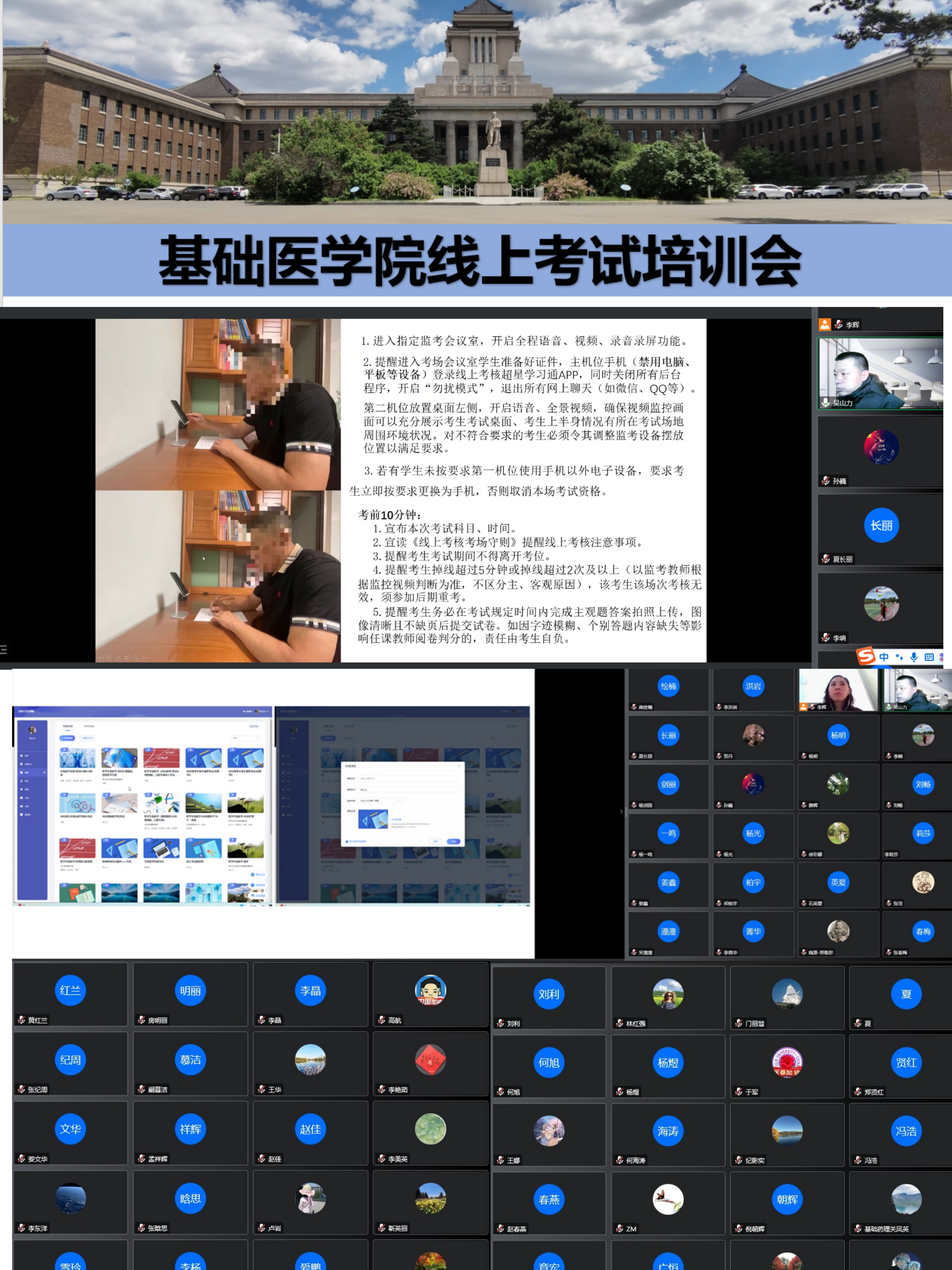 本次培训的主讲人为我院生物化学与分子生物学实验中心主任吴山力老师。吴山力老师从考试分班与设置、建立试卷、线上监考防作弊功能设置以及试卷批阅等多个方面详细讲解了 “学习通”平台在线考试具体操作方法。同时,吴山力老师对腾讯会议学生监控机位的设置要求、教师监考流程以及注意事项进行了解读。与会教师们积极参与讨论,对学生考试中手机切屏、学习通掉线及机位摆放等情况提出问题,吴山力老师逐一进行了解答。会后,教务办共享了本次培训交流会的PPT和录制文件,供教师们反复学习。