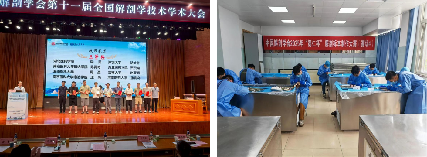 人体解剖学系实验室主任赵航与赵亚明老师受邀参加中国解剖学会第十一届全国解剖学技术学术会议,并代表我校参加解剖标本现场制作比赛。此次比赛共吸引了来自全国40余所高校的近70名师生参与,竞争激烈,精彩纷呈。比赛过程中,参赛选手需在限定时间内现场完成标本制作,充分展现个人的解剖学知识、操作技能与艺术表达。赵亚明老师凭借扎实的专业功底、娴熟的技术操作和对细节的精准把控,在比赛中展现出良好的专业素养,荣获教师组三等奖。此次获奖不仅体现了我院教师在解剖学技术领域的专业水平与精益求精的精神,也彰显了我院在解剖教学与技术传承方面的深厚积淀和综合实力,为学校赢得了荣誉,进一步巩固了我院在全国解剖学教学领域的影响力。
