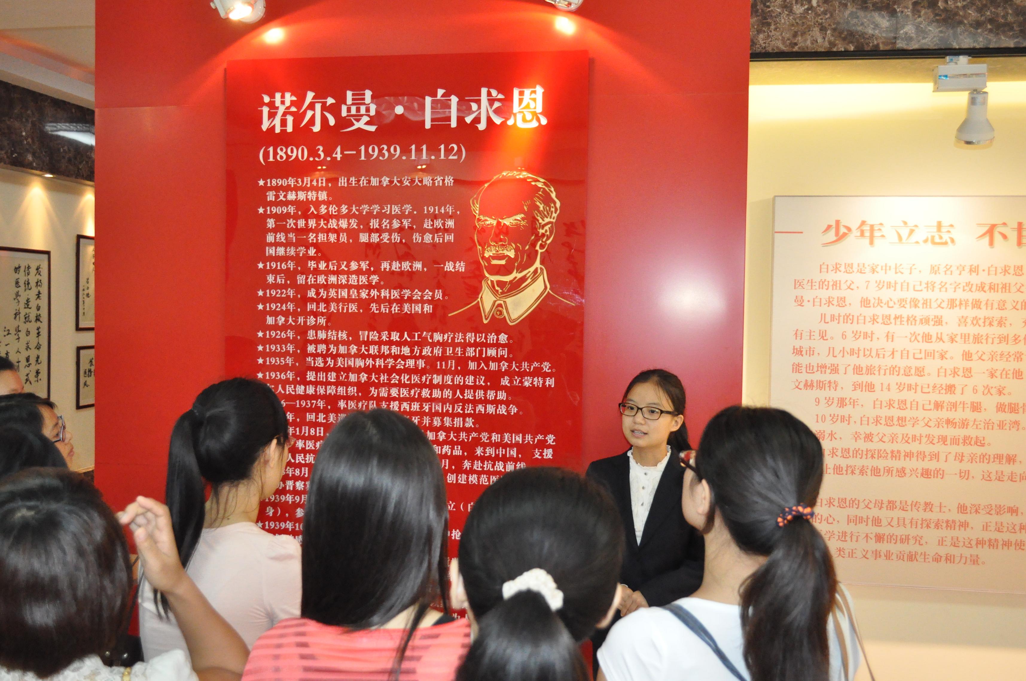三名本科生讲解员分别详细讲解了白求恩为我校医学教育事业做出的贡献。随后,沿着医学教育的发展足迹,介绍了我校医学70年的辉煌历史。看着一个个杰出的校友、一个个突破性的研究成果、一幅幅珍贵的老照片……同学们顿生钦佩之情,切实感受到医学前辈们的伟大。最后研究生们在伟大的国际主义战士诺尔曼•白求恩大夫的雕像前合影留念。
